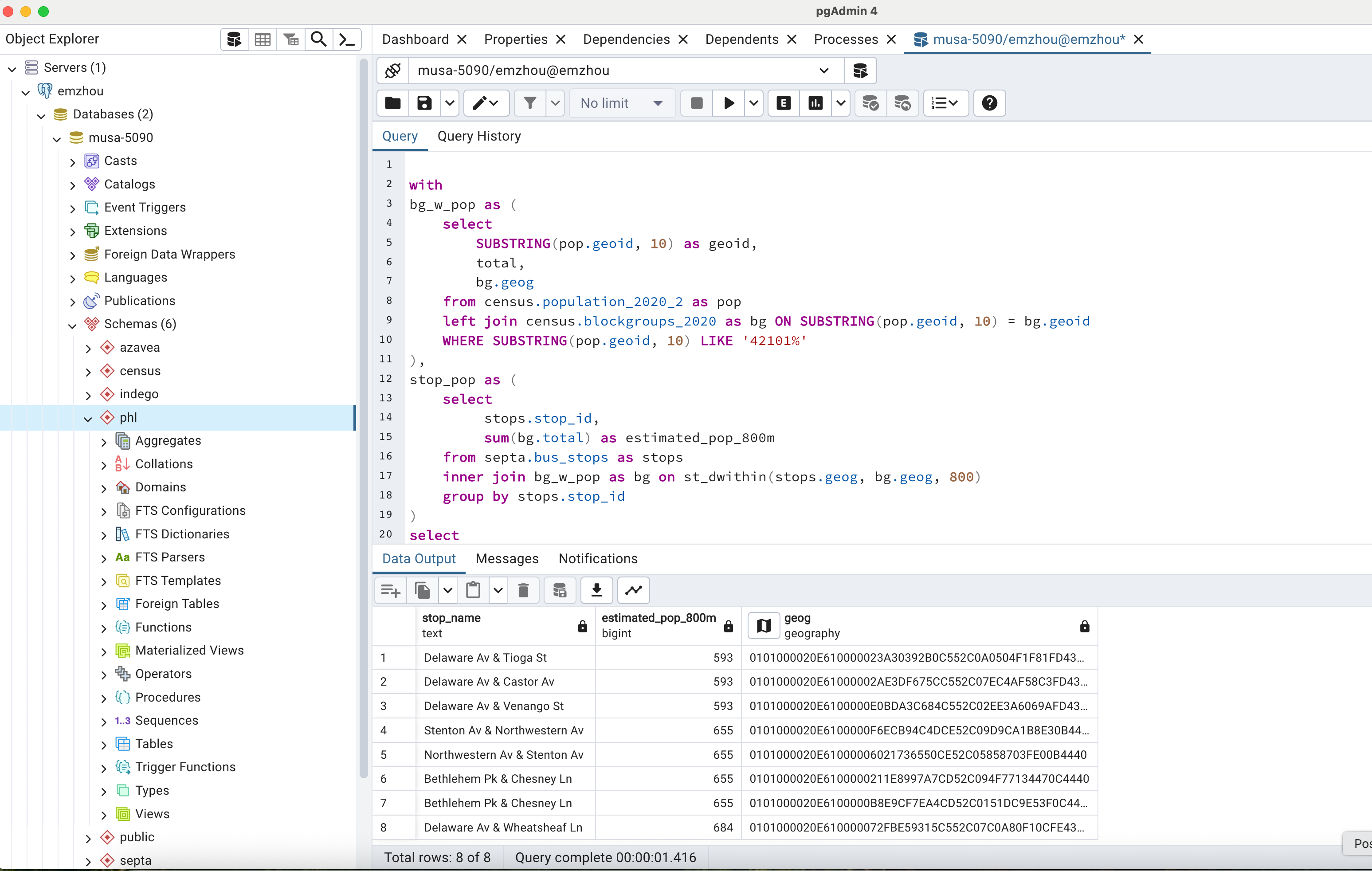 If we were to conduct this analysis in a GIS software, we would use a spatial join tool that identifies all block groups within 800 meters of each bus stop and sums their populations. However, if working within a spatial database, we can write a SQL query that performs this operation directly (Figure 1).